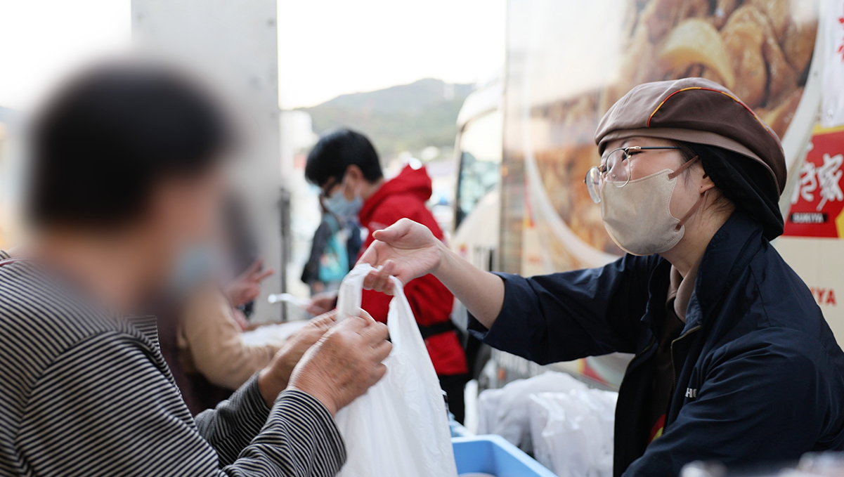 被災された方々に温かい牛丼やみそ汁などの提供を行いました。