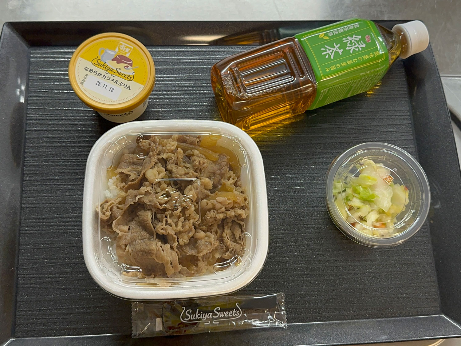 近隣のすき家から温かい牛丼が届けられ、おしんこやプリン、ドリンクと一緒に提供しました。